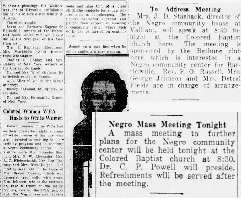A WPA meeting took place in the home of Mrs. Bessie Johnson, a Black woman from West Bartlesville. A group of Black women and white women sat around the same table, and their names appeared side by side in the Bartlesville Daily Enterprise. On the surface, it looked like a routine meeting. Beneath it was something deeper. Families across Bartlesville were dealing with pressures from different directions, yet their needs converged into a shared hope that a community center could strengthen both sides of town.